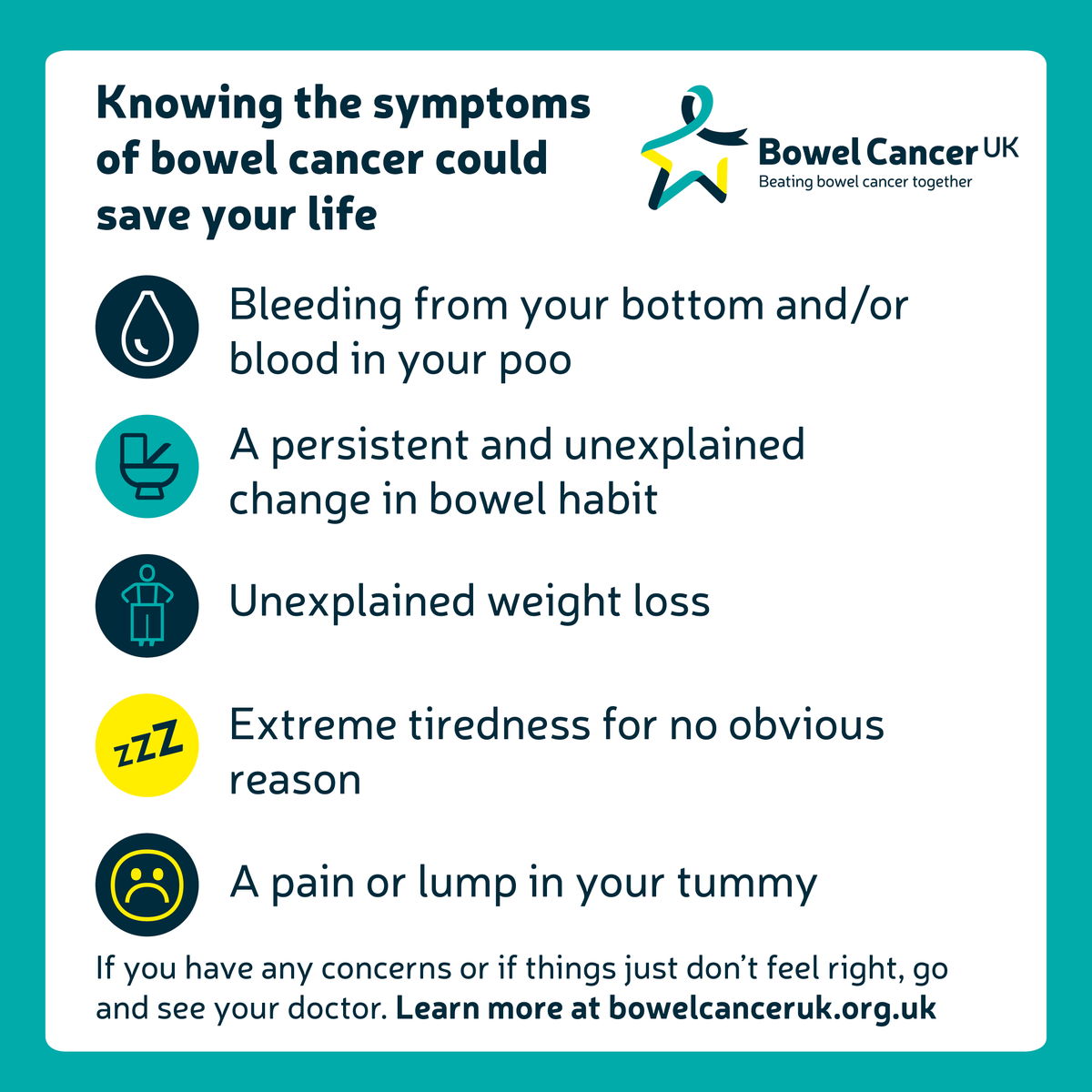Colorectal cancer typically affects older adults, with the majority of people diagnosed aged 50 according to cancer council australia, sings and symptoms of bowel cancer include abdominal pain or bloating, a persistent change in your bowel. Below are 10 common signs of bowel cancer that you should know. We're supporting the be clear on cancer bowel cancer campaign. Bowel cancer can be treated using a combination of different treatments, depending on where the cancer is in your bowel and how far it has spread. Colorectal (bowel) cancer is the third leading cause of deaths from cancer in the developed world, but only 5.4% of us will develop it.